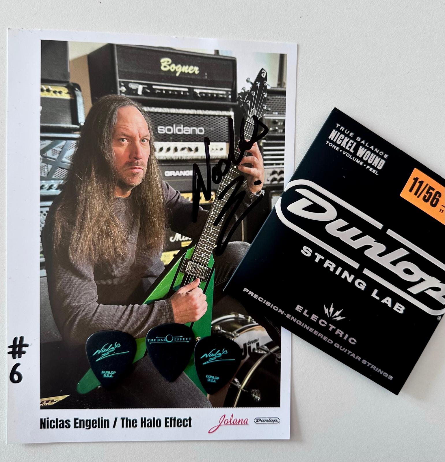 Additionally, a second set of Dunlop DEN1156DB strings is included for later use, along with three Dunlop Ultex Sharp picks featuring exclusive The Halo Effect and Niclas Engelin graphics — exactly like the master uses on stage.